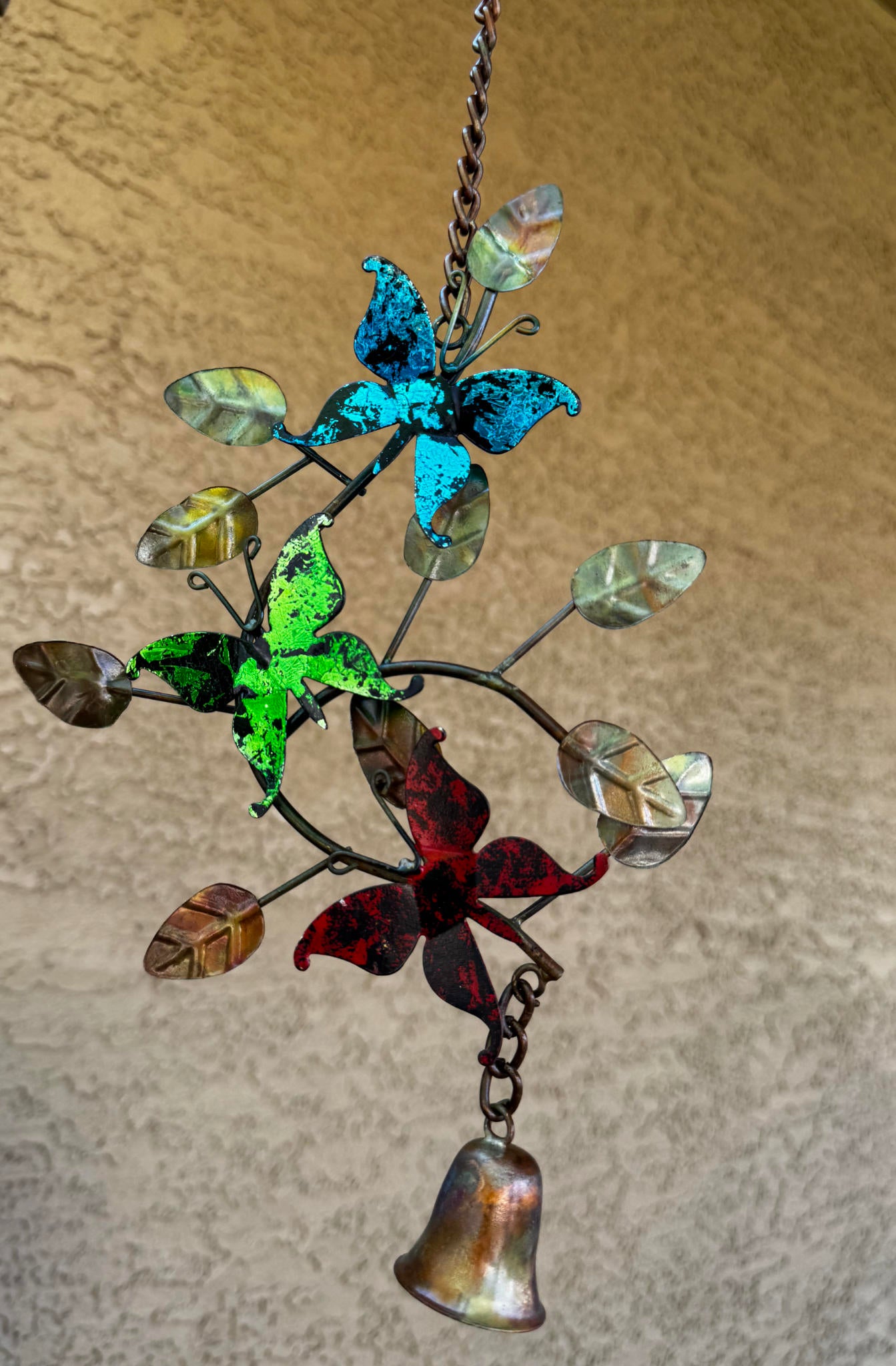 Decorate your home with our multicolor metal butterfly garden chime. This eye-catching hanging decor will bring vibrant color and a touch of nature to any room. Hang it outside and watch as the bells gently chime in the breeze or hang it inside. Perfect for any butterfly lover and a unique addition to your home decor!