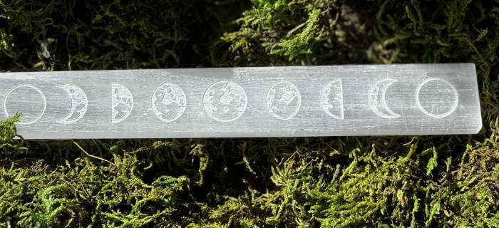 Selenite wand with engraved phases of the moon.