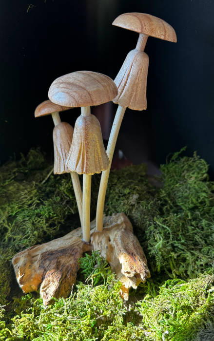 Three Carved Mushrooms on Driftwood