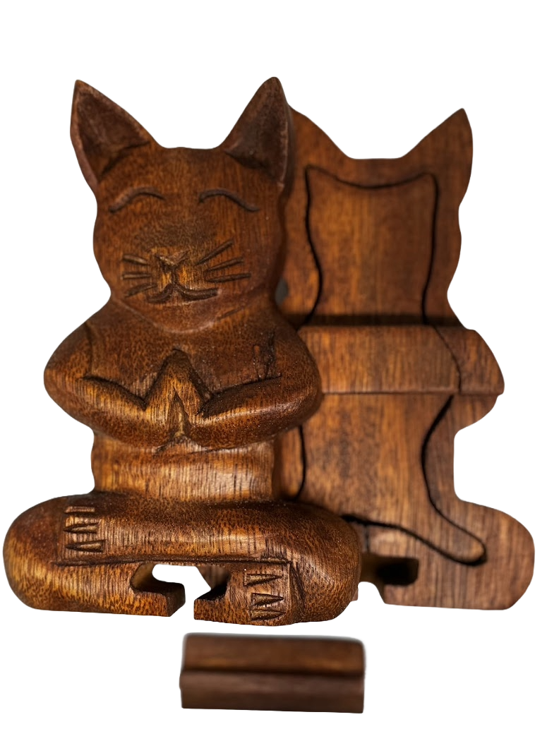 Our Wooden Meditating Cat is more than just a decorative piece; it's a symbol of peace, and mindfulness. Whether you're an avid meditation practitioner or simply someone who enjoys surrounding themselves with pieces that remind you of your favorite four legged friend this piece is designed to elevate your space and your spirit. A unique decorative box that is a puzzle as well.